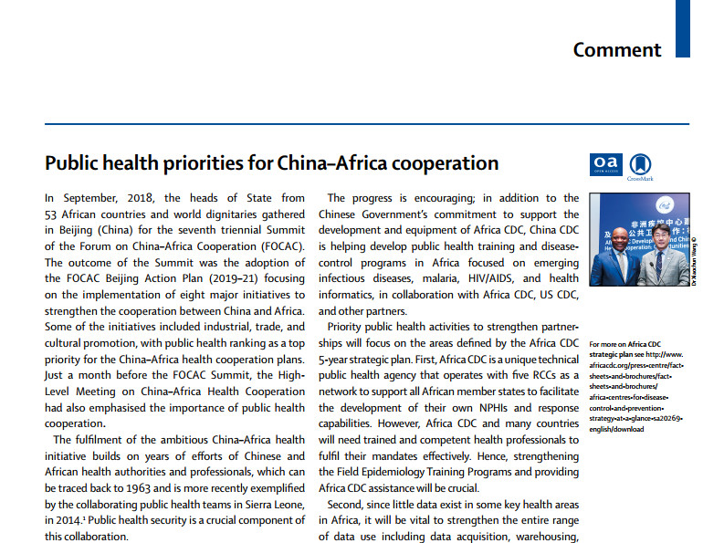 中國疾控中心主任高福院士與非洲疾控中心主任約翰.肯格松聯(lián)合發(fā)表“中非合作,公衛(wèi)先行”評論文章